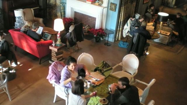 A little less than a year ago, several people started working on the idea of transforming the old, little-used Fellowship Hall under the sanctuary into a coffee house (like Amelie’s in NODA, pictured above). A vision emerged that Caldwell could offer a space where coffee, comfort and community converge. It would also be a space Caldwell could use for gatherings, fellowship events, classes and more.
